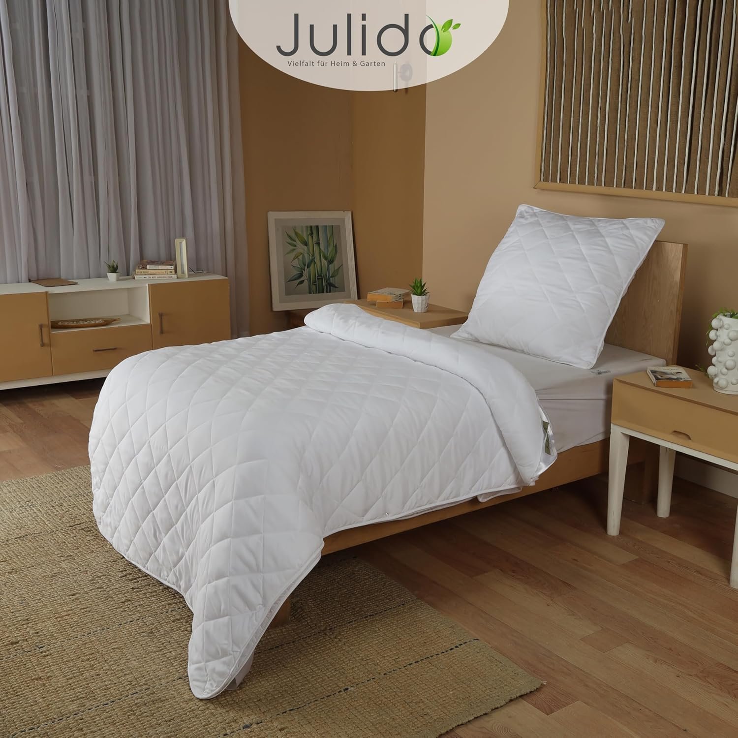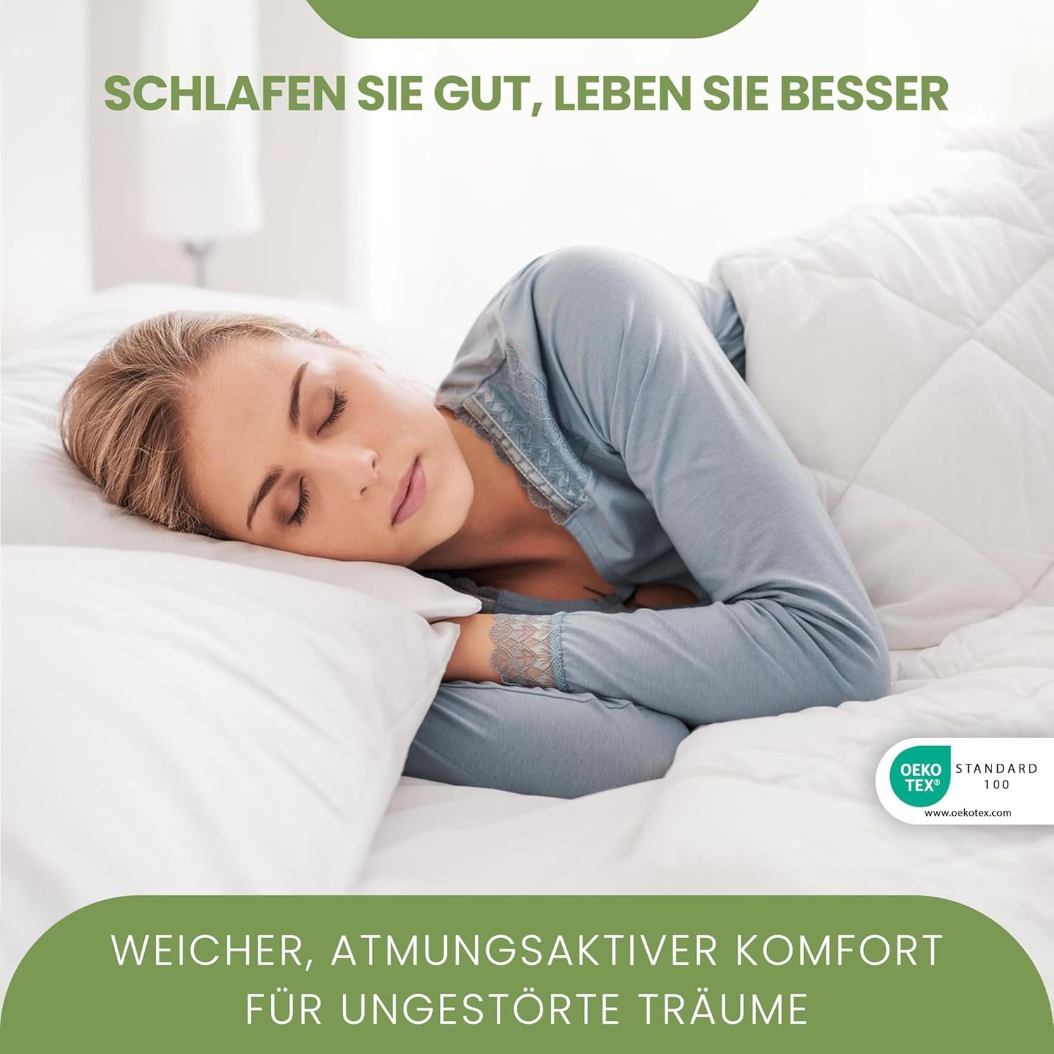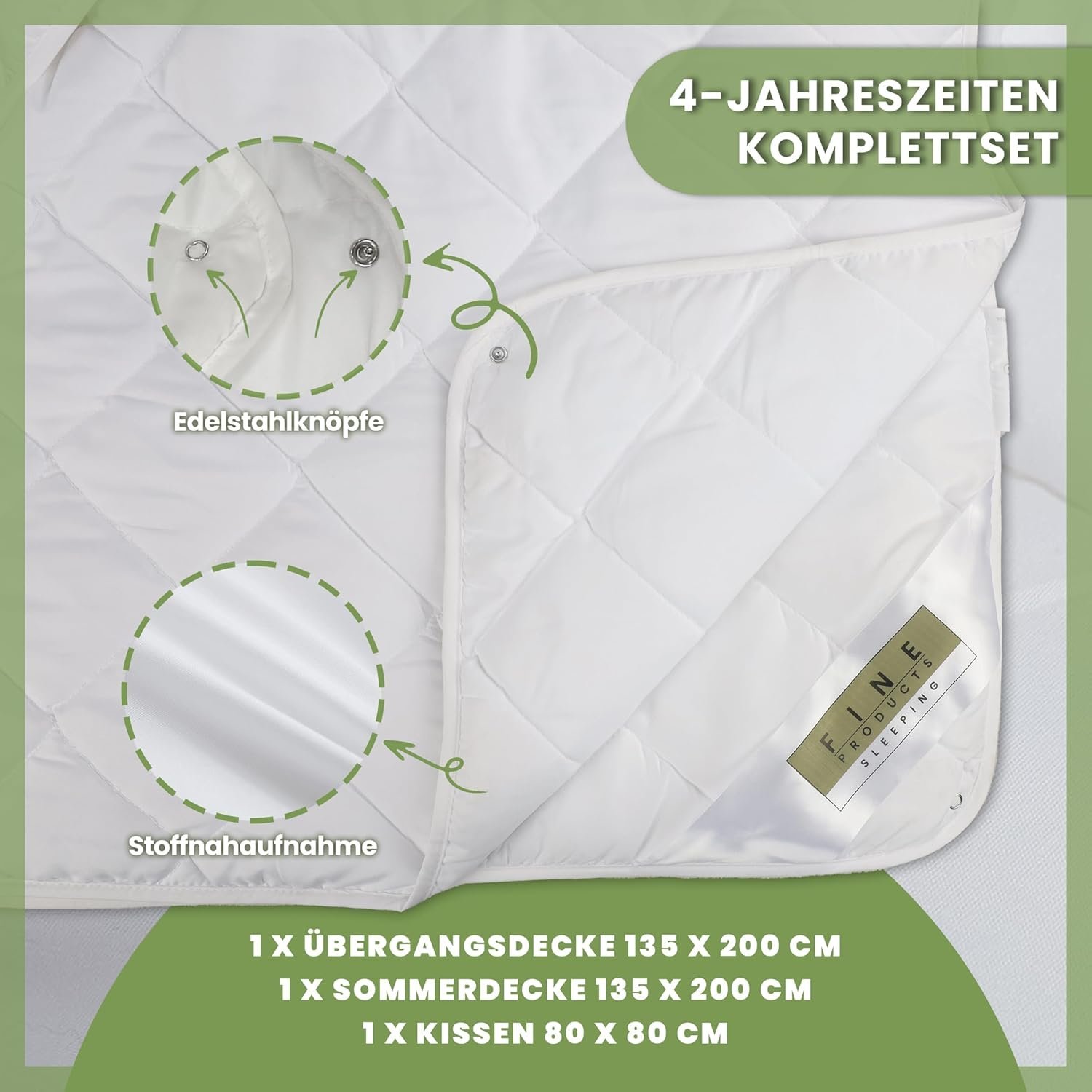 • Bettdecken-Set: Unser 4-Jahreszeiten-Bettdecken-Set 135 x 200 cm mit Kissen 80 x 80 cm bietet Ihnen das ganze Jahr über unbeschwerten Schlafkomfort. Die Bettdecke (700 g + 840 g) lässt sich zu einer warmen Winterdecke kombinieren, und das 1000 g Kissen bietet optimale Unterstützung.