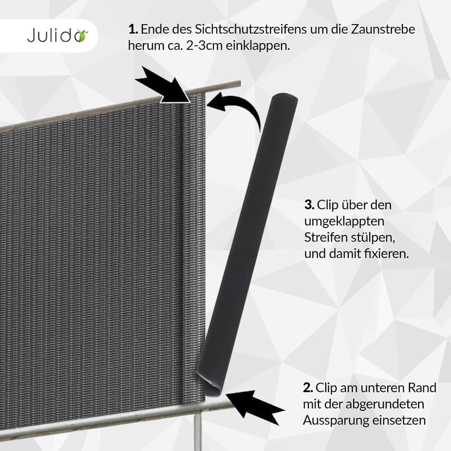 - Einfache Montage: Die Clips werden einfach auf die gefalteten Enden der Sichtschutzstreifen geschoben.